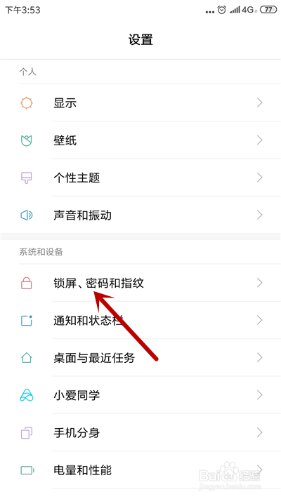 进入设置界面,点击【锁屏、密码和指纹】。