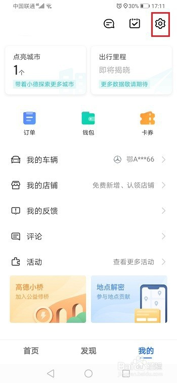 第一步打开高德地图,进去小我中间,点击右上方设置图标,如下图所示:
