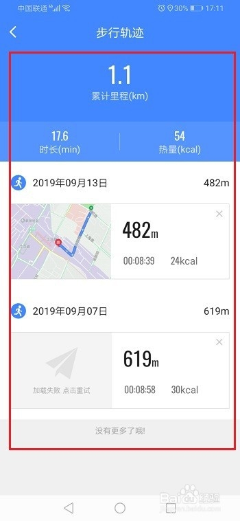 第五步进去步行轨迹界面之后,可以看到记实的步行导航记实,其他骑行的也是一样,若是是驾驶的在驾驶当作就中查看,如下图所示: