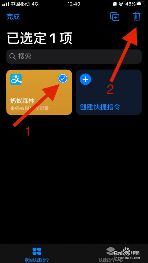 快捷指令右上角呈现了一个圆形,直接点击,然后在点击右上角的垃圾箱图标也可以删除快捷指令