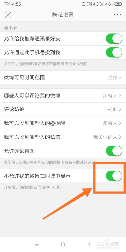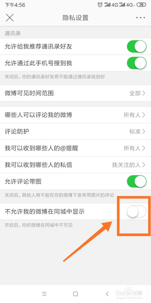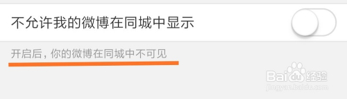 可以看到【不许可我的微博在同城中显示】右边的按钮是开启的。