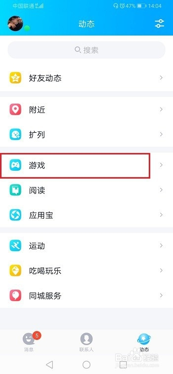 第一步打开手机qq,进去动态界面,点击游戏,如下图所示: