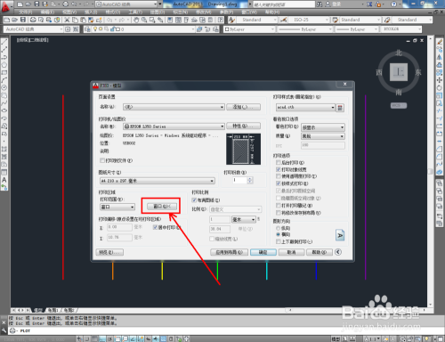 点击【打印】,弹出打印设置栏后,按图示设置好彩图的各项设置。点击【窗口】,框选出需要打印的图纸;