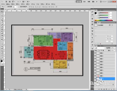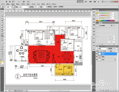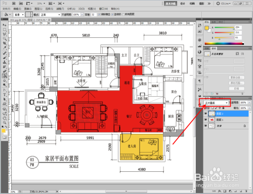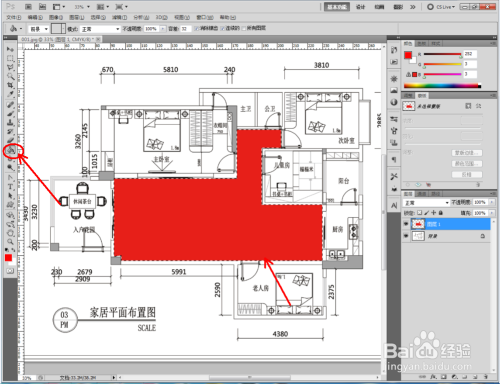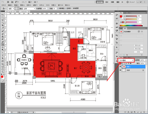 点击右下角的【新建图层】图标,新建一个图层1后,点击【多边形套索东西】将客餐厅区域框选出来。将前景色设置为:红色后,点击【油漆桶东西】对选区进行颜色填充。完当作后,将图层设置为:正片叠底模式;