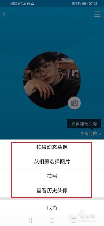 第三步进去小我本家儿页之后,点击头像,进行更改头像,如下图所示: