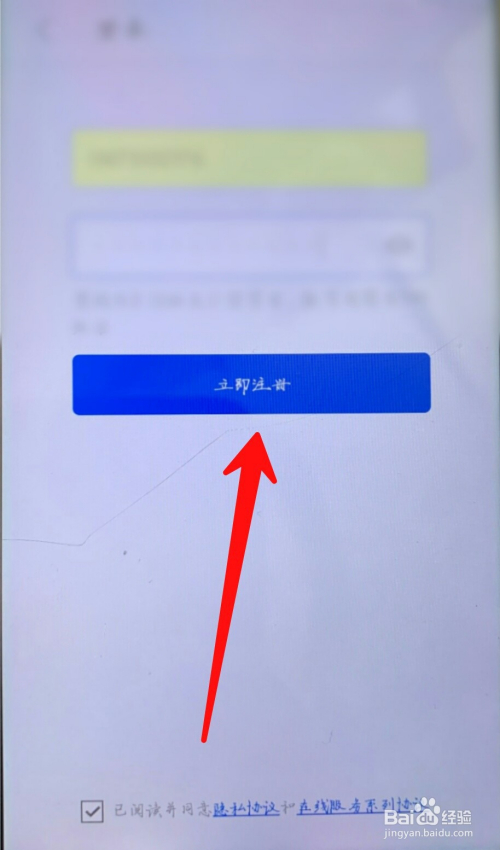 第八步,此刻呈现的界面,小可爱都知道要怎么做了吧,对的,就是输入“手机号”和“密码”,然后去点击下方“已阅读······”勾选框,接着再点击“当即注册”啦!