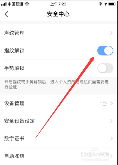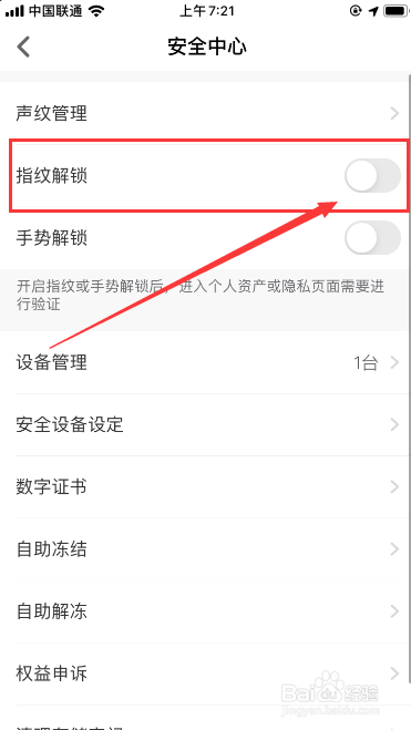 页面跳转后,如下图所示,点击指纹解锁后方的【按钮】。