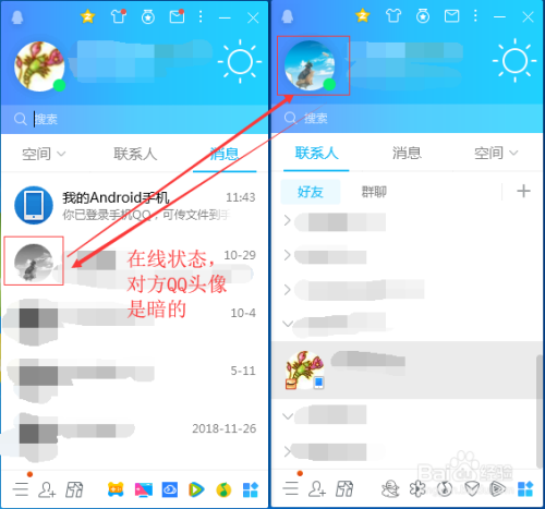 我们打开“那个QQ”,做比力。我明明在线,在他(她)何处是暗的。