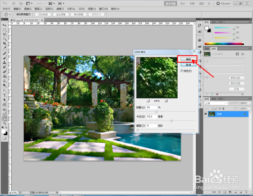 点击【滤镜】-【锐化】-【USM锐化】,按图示设置好USM锐化的各个参数;