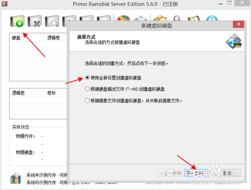 安装Primo Ramdisk软件后启动它,点击第一个按钮添加内存盘,在弹出界面选择“利用全新设置建立虚拟盘”,然后按图中步调设置软件。