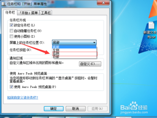 在使命栏和菜单属性中在屏幕上的使命栏位置,进行点击下拉。