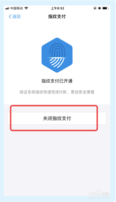 5.在接下来的界面,选择并点击【封闭指纹支付】选项;