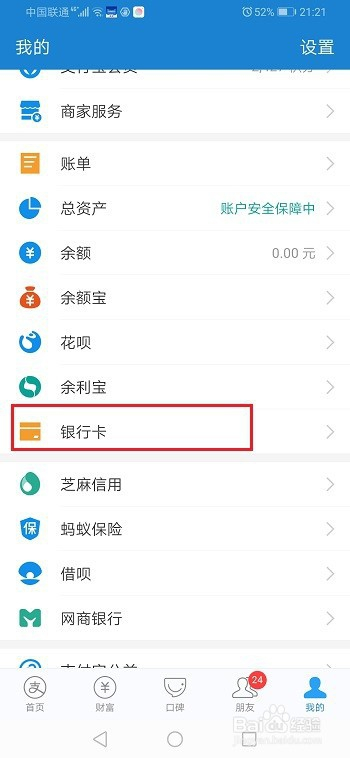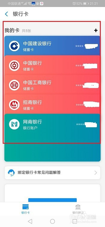第三步我们看一下绑定了几多张银行卡,点击银行卡进去,可以查看绑定的银行卡,如下图所示:
