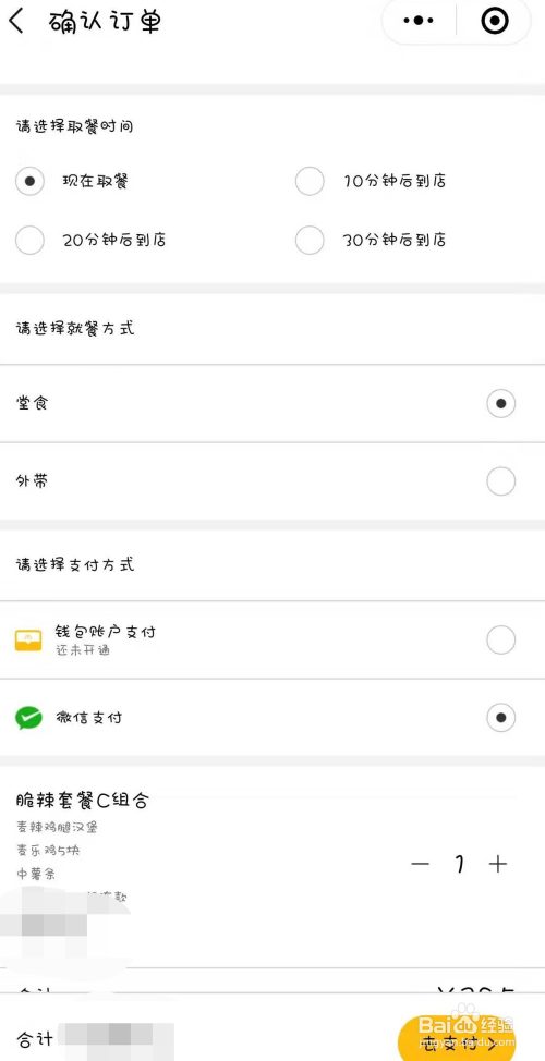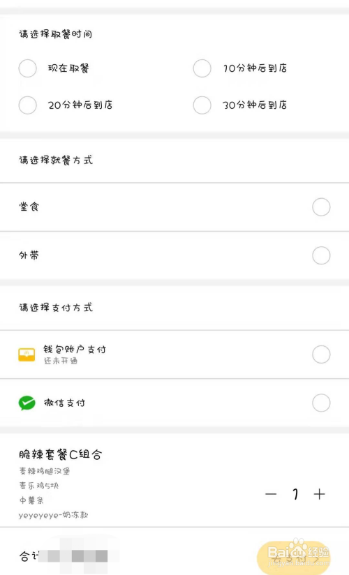 选好餐之后,接着还要选择“取餐时候”“就餐体例”和“支付体例”;