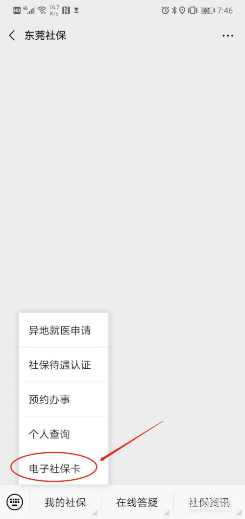 4.进入东莞社保公家号,找到“我的社保>>电子社保卡”,如图