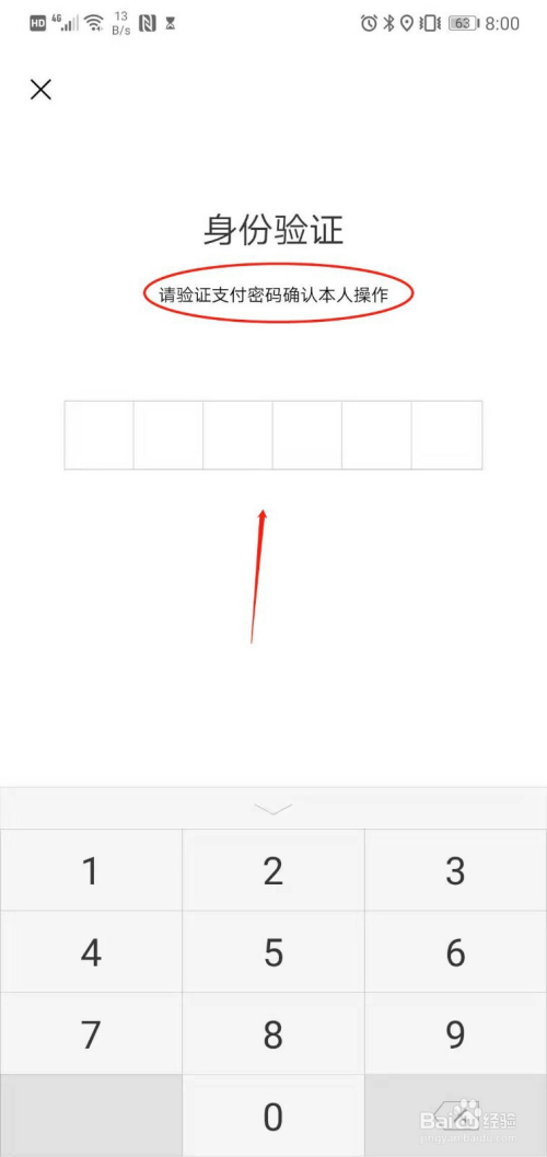 6.进入“身份验证”,输入微信支付密码进行确认。如图