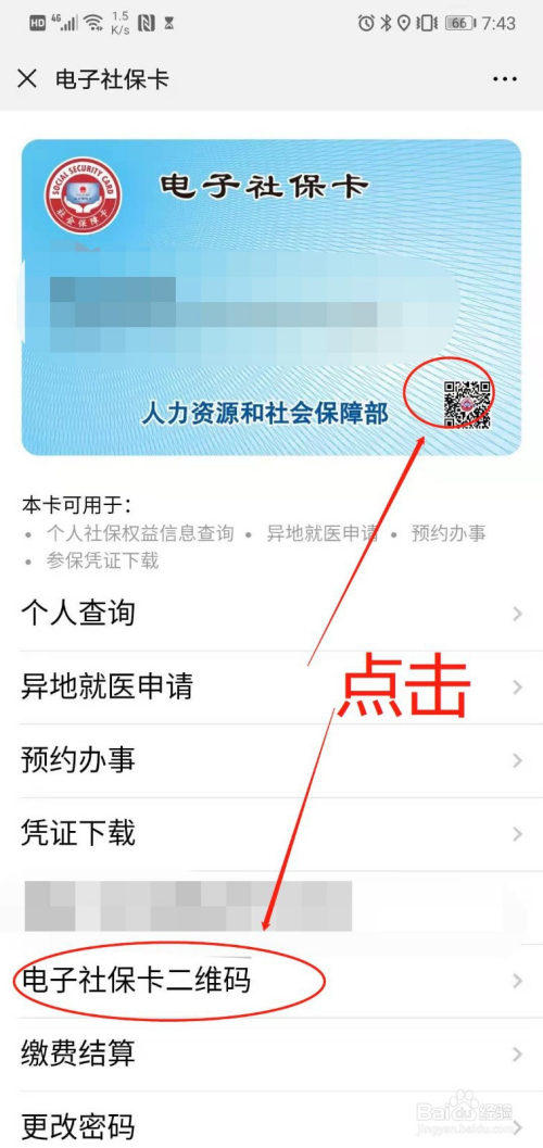 9.进入电子社保卡,选择卡右下角的二维码图标,或底部的电子社保卡二维码,如图