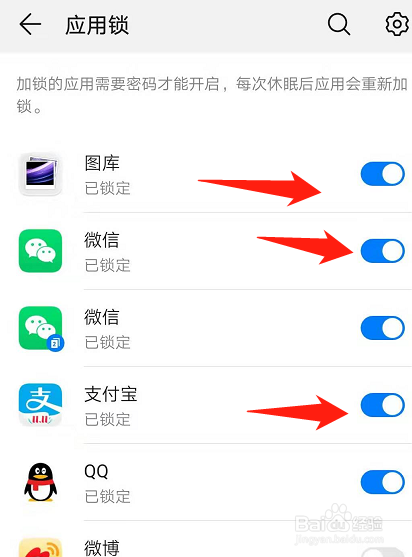 打开你想设置指纹应用锁软件后边按钮即可。