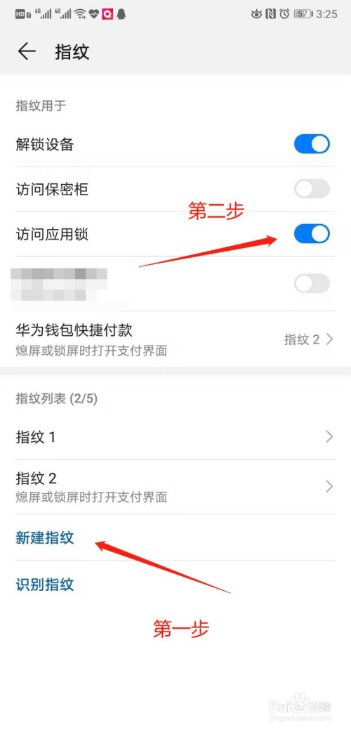 进入指纹设置界面,先选择“新建指纹”,设定本身的指纹,若是你已经设定好,就不消管了,然后再将“拜候应用锁”打开,具体如下图所示。