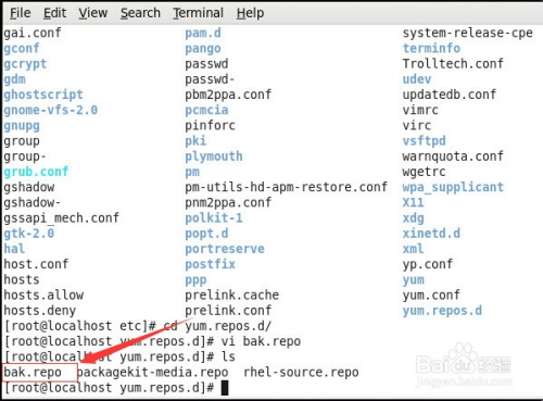 在etc目次可以查看到yum.repos.d,所有的yum文件是存在这个文件的目次下,输入:cd yum.repos.d