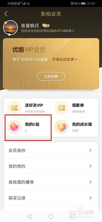 第二步进去会员界面之后,点击我的u豆,如下图所示: