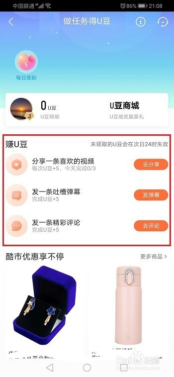第四步选择一个喜好的视频,进行分享可以进行获得u豆,获得u豆之后需要实时领取,否则会作废的,如下图所示: