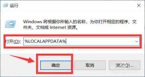 在窗口输入框内输入“%LOCALAPPDATA%”,并单击”确定“,如图所示;