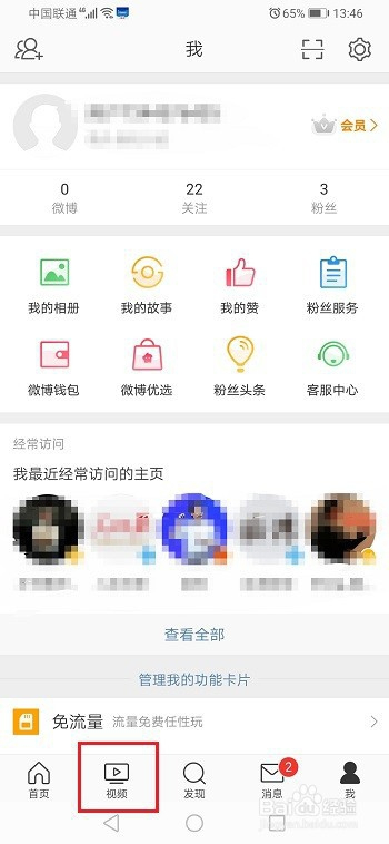 第一步在我们的手机上打开微博,进去我的界面,点击底部的视频,如下图所示: