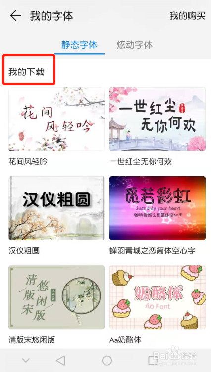 若是不知道选哪个字体,可以下载多个字体样式对比一下。也可以先下载保藏在手机里面,下次再用。点击页面内“我的”-“我的字体”-“我的下载”即可看到已经下载的字体。