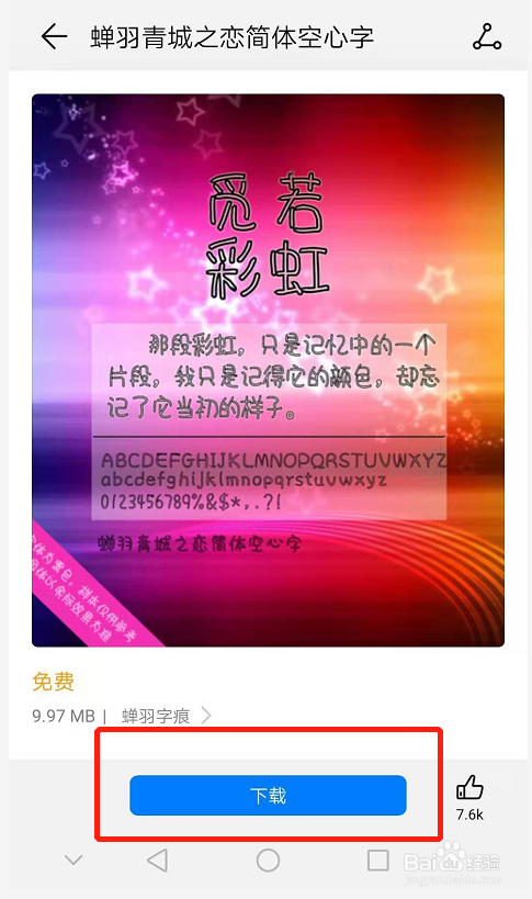 免费字体中有良多分歧的字体样式,可以从中遴选本身喜好的字体。例如选择“蝉羽青城之恋简体空心字”,点击“下载”-“应用”,就可以利用该字体样式了。手机所有字体换改换为“蝉羽青城之恋简体空心字”。