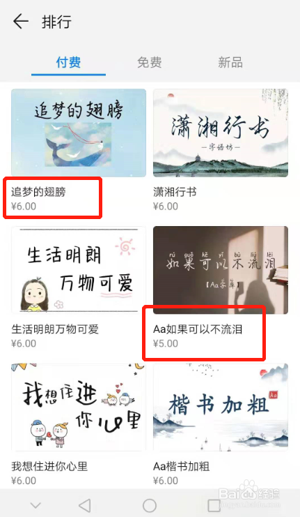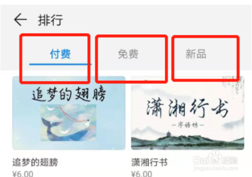 字体样式页面内点击“排行”,可以看到三个分歧的分类,别离为付费、免费和新品。