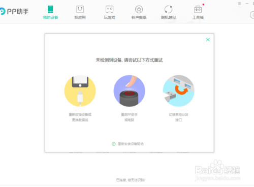 毗连手机到电脑后,PP助手会主动检测设备,同时安装相关的驱动程序,若是检测不到设备,可以用下方式解决。