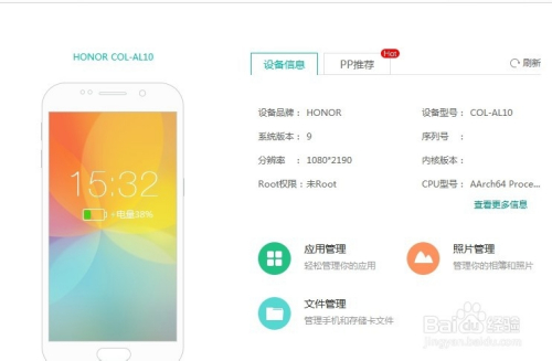 打开USB调试模式后,电脑上的PP助手就会主动毗连手机,毗连当作功后,就可以利用PP助手办理我们的手机了。