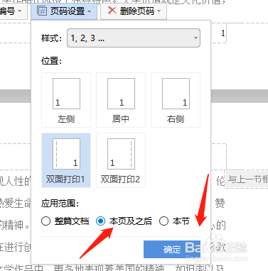 我们选择“本页及之后”选项,这个选项的意思是从该页起头,从头调整下之后的页码。