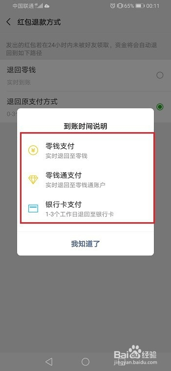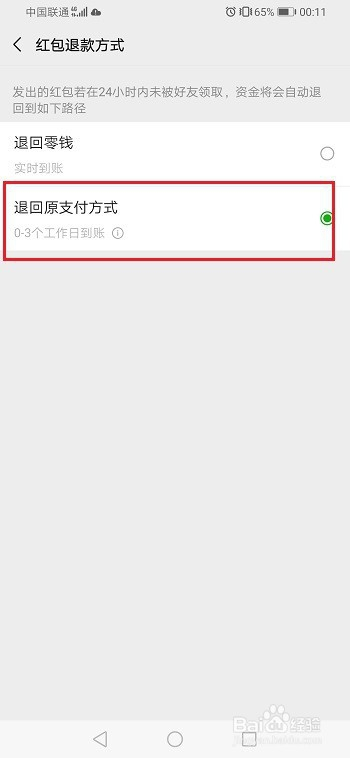 第四步红包退条目体例可以选择退回到零钱也可以退回原支付体例,如下图所示: