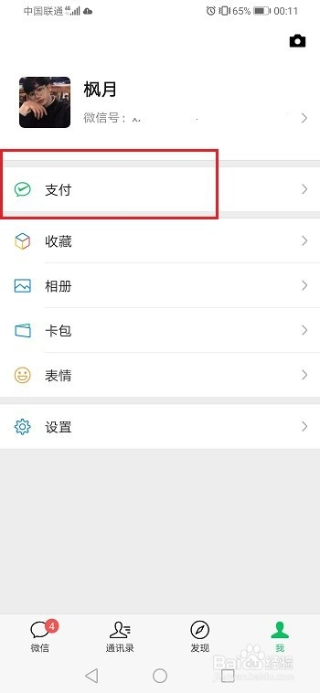 第一步打开微信,进去我的界面,点击支付,如下图所示: