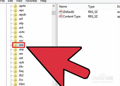 找到HKEY_CLASSES_ROOT\.exe。利用左边的导航树打开这个目次。