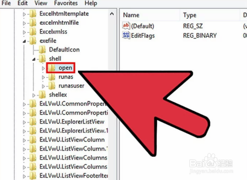 找到KEY_CLASSES_ROOT\exefile\shell\open。利用左边的导航树打开这个目次。