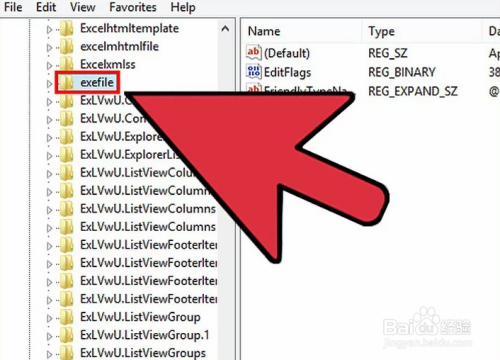 找到HKEY_CLASSES_ROOT\exefile。利用左边的导航树打开这个目次。