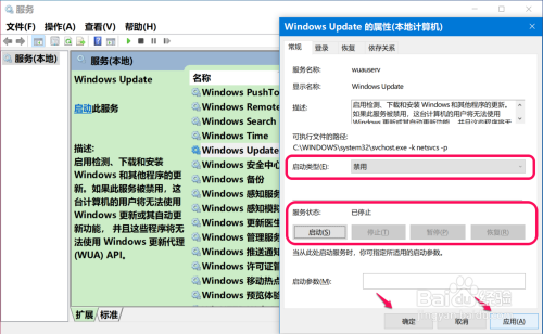 ① 进入当地办事窗口中,遏制运行 Windows Update 办事;将 Windows Update 办事的 启动类型由【手动】更改为【禁用】,办事状况由【正在运行】更改为【遏制】;