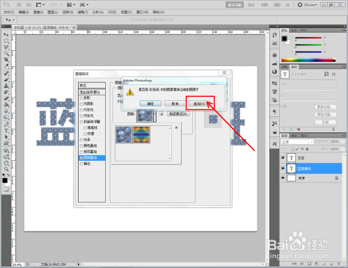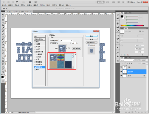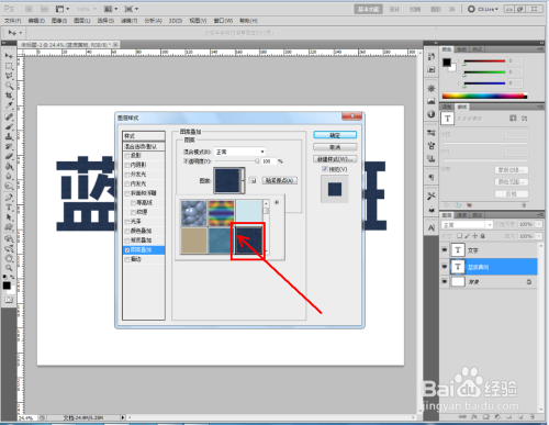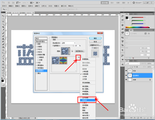 双击图示自界说图案图层,弹出图层样式设置栏。勾选【图案叠加】,点击图示小三角,弹出图案选项栏;