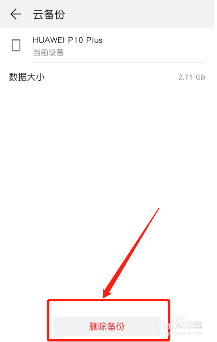 页面会显示云储存数据大小,点击页面中的删除备份,然后确认删除。