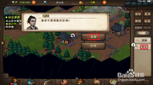 接着点击【生意】。跟他买【烧刀子】酒。之后花二百文银子买下【烧刀子】酒。