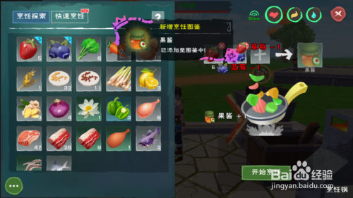 这样果酱就做完了,果酱可以+20食物,比单吃草莓或蓝莓加的属性要多。菜谱研究完当作后可以利用“快速烹调”功能批量做果酱。