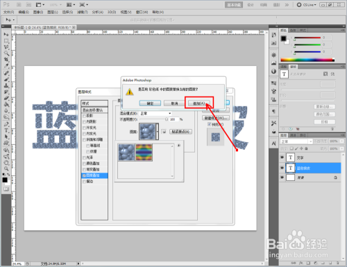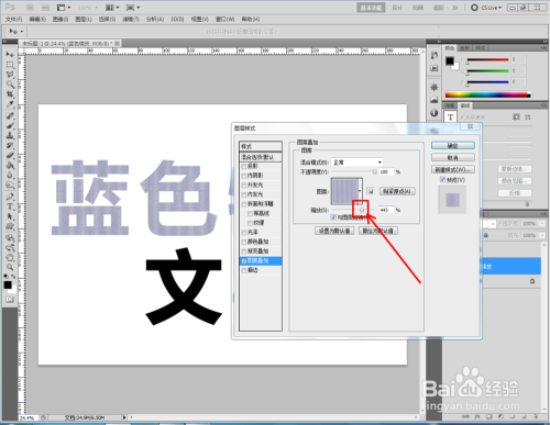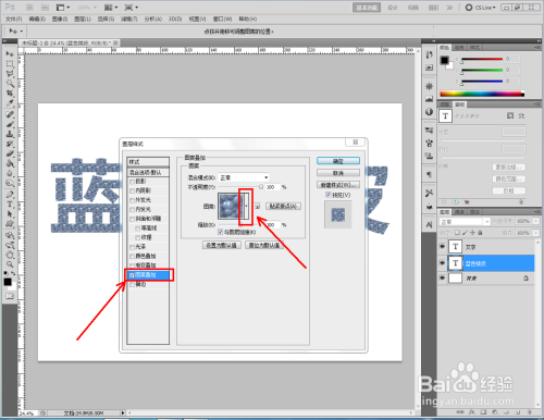 双击图示自界说图案图层,弹出图层样式设置栏。勾选【图案叠加】,点击图示小三角,弹出图案选项栏;