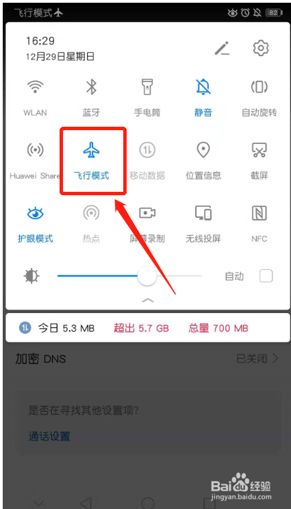 “飞翔模式”也可以快捷体例打开。下拉快捷功能页面,点击飞机图标,直接开启“飞翔模式”。