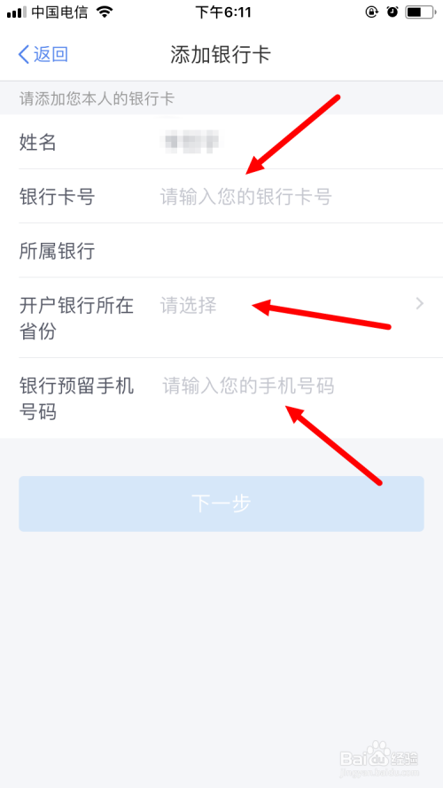 接着鄙人一个页面中,输入本人的银行卡卡号、开户行地点省份以及银行预留手机号码。