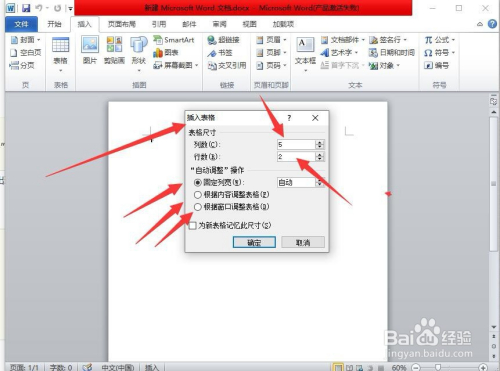 然后在弹出的"插入表格"窗口中,输入行数和列数,并按照现实环境选择响应的“主动调整”操作选项。
