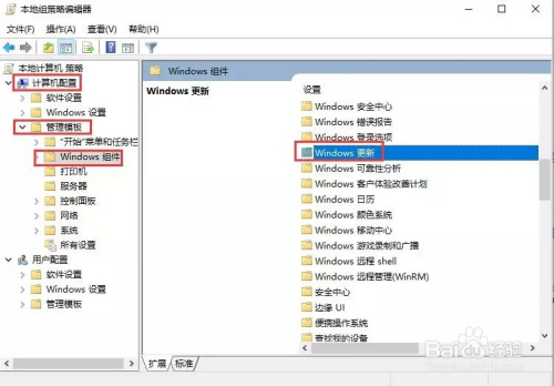 依次选择【计较机设置装备摆设】、【办理模块】、【Windows组件】、双击【Windows更新】