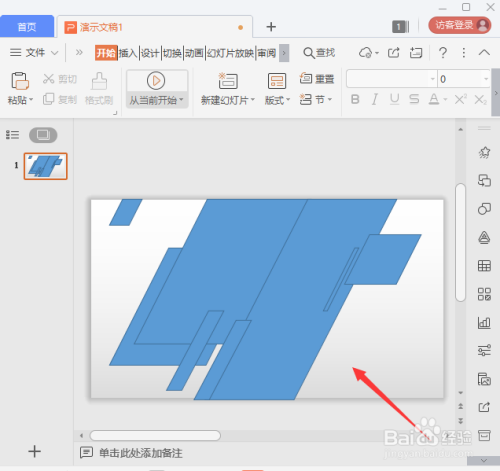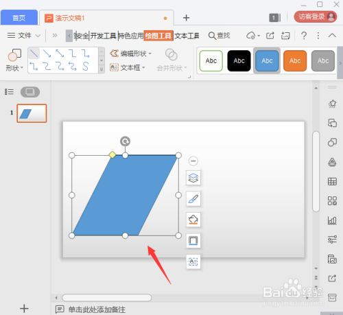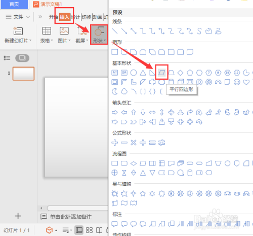 打开PPT,在上方点击【插入】-【外形】选择【平行四边形】,如图所示。